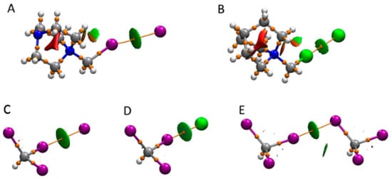 Superposition of the results of the QTAIM and NCI analyses of DABCO-CH2I+···I− (A), QN-CH2Cl+···Cl− (B), CHI3···I− (C), CHI3···Cl− (D), and CHI3···CHI3 (E). The bond paths and BCPs (QTAIM) are shown as orange lines and spheres, respectively, and blue-green areas indicate bonding interactions (NCI).