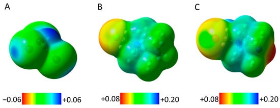 Surface electrostatic potentials (at an isovalue of 0.001 in atomic units) of XB donors CHI3 (A), QN-CH2Cl+ (B), and DABCO-CH2I+ (C).