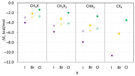 Binding energies in the XB (filled circles) and HB (open rhombics) complexes between (CH3)3N and halomethanes CHnXm. Color code: purple—iodine, yellow—bromine, green—chlorine.