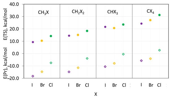 Energies (relative to reactants) of the transition states (filled circles) and products (open rhombics) of the SN2 reaction between (CH3)3N and halomethanes CHnXm. Color code: purple—iodine, yellow—bromine, green—chlorine.