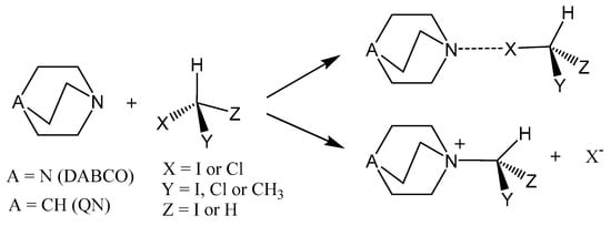 The interaction of DABCO with halomethanes resulting in the formation of quaternary ammonium cations also highlights the potential competition of halogen bonding and nucleophilic substitution reactions. Indeed, the halogen atoms in the halogenated alkanes are not only common XB donors but are also typical leaving groups in nucleophilic substitution reactions [26]. In turn, tertiary amines are both effective XB donors and nucleophiles. Thus, the development of a successful crystallization procedure involving these reagents requires an understanding of the interplay and competition between these processes. While several publications reported that the interaction of CH2X2 (X = Cl, Br or I) with DABCO (or other trialkylamines) resulted in facile nucleophilic substitutions (vide supra), the analogous interactions of trihalomethanes or tetrahalomethanes with the same nucleophiles led to the formation of XB associations between these strong XB donors and acceptors [4,27,28]. The absence of the products of nucleophilic substitutions in the systems with tri- and tetrahalomethanes is probably related to the higher barrier for such reactions between alkylamines and tri- or tetrahalomethanes compared with those with mono- and dihalomethanes. However, to the best of our knowledge, the energetics of these processes and the reason for such changeovers were not explored up to now.