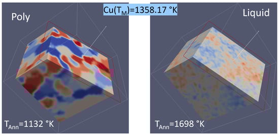 Poly-Cu volume simulated at the constant annealing temperatures indicated: below (left graph) and above (right graph) the melting point TM = 1358.17 K: the solid(poly)-liquid transition is recovered.
