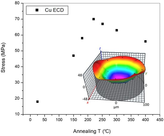 However the application of a Cu-based metallization scheme requires an accurate control of the morphological evolution of nano- or poly-crystalline Cu film during the processing steps [,]. Indeed, despite the cited advantages, nearly room temperature electroplated copper has unstable grains, with a high density of defects such as impurities coming from bath, dislocations, and grain boundaries, which can be considered as the main source of a large amount of energy stored in the as-deposited fine grains of electroplated Cu films [,]. Therefore, the layer has to be thermally stabilized. Thermal treatment of thick Cu deposited on semiconductors’ substrates modifies the composed system at different scales. For instance, Cu in direct contact with Si can lead to relevant kinetic reaction at relatively low temperature []. Moreover, micro-structural modifications in the Cu film, induced by the grain densification phenomenon, transfer a stress field in the elasto-plastic regime to the substrate [], which has a dramatic effect as global warpage of wafers.