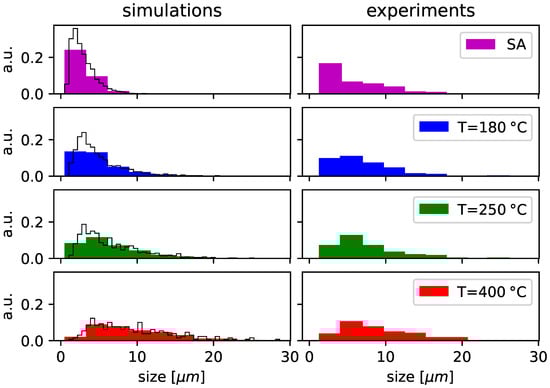 Reliable considerations can be derived by integrating SEM post-process analysis with kinetic simulations. In terms of final state description, they are in a significant agreement as the comparisons of the final snapshots and grain size distributions in the Figure 3 and Figure 4 demonstrate. The use of the 3D simulations offers significant vantages in the study of the kinetics with respect to the theoretical scheme based on grain mean-size only [,], since the full size distribution can be properly modelled. We notice that, to align in parallel experiments and simulations, the snapshots in Figure 3 are shown within the same space scale and the statistical analysis in Figure 4 are performed with the same bin intervals of 2.25 m width (coloured bars in left and right columns of Figure 4). The simulations are performed in a rather large simulation box () and the analysis can be extended in the whole three dimensional film structure, allowing for a more refined statistic of the size distribution (i.e., with a smaller bin), as the ones shown (with 0.45 m bins’ width) with the black line contours of the bars in the graphs reported in the left column of Figure 4. We notice that the combination of structural analysis and simulations indicates that, in spite of the non monotonic behaviour as a function of the temperature shown in Figure 2, the Cu grain densification occurring at the micro-scale drives the stress behaviour at the wafer-level. The impact of the temperature on the ripening phenomenon is clearly evidenced by the simulations and validated by the experimental data. The driving force for the ripening is the reduction of the grain boundaries, due to their energetic cost with respect to the bulk, with a consequent global contraction of the film, no additional modification to the Pott model formulation is necessary to recover the experimental scenario. The simulations calculate a final reduction of the grain boundary volume of 55%, 41%, and 27% for the 180 C, 250 C, and 400 C cases respectively with respect to the self-annealed post deposition state.
