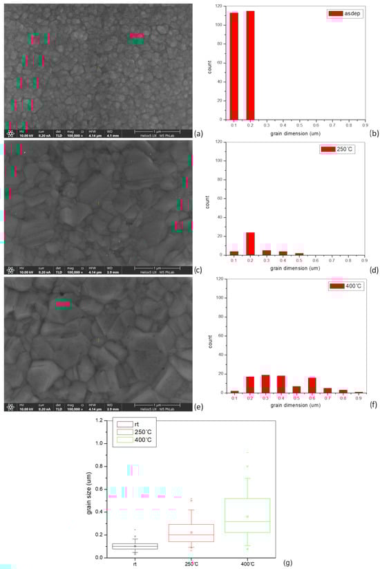 Microstructure of samples after deposition (a), 250 C (c), 400 C (e), and respective grain-size distribution (b,d,f). Box plot of grain sizes at different temperatures (g). The square marker represents the mean of the distribution; the × and dashed markers represent (from bottom to top) its 1st, 5th, 95th and 99th percentiles; the horizontal line within the box represents its median.