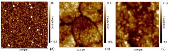 Surface roughness changes on a 10×10 area are shown in Figure 8. An almost flat surface with Rq = 3.5 nm has been found on the as-deposited samples (Figure 8a). After the thermal treatment, the Rq value increases to 18 nm in the case of 250 C (Figure 8b) and 20 nm in the case on 400 C (Figure 8c).