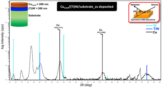 To identify the structural modification that both and samples undergo after thermal treatment at different temperatures, XRD analyses have been done in symmetric XRD configuration (see the top right inset of Figure 9). The XRD pattern of the entire sample in as-deposited conditions is shown in Figure 9. We can observe the different contributions of W (light blue line), (Ti)W (blue line), Cu (black line), and the other peaks related to the substrate. The schematic reported in the inset on the top left shows the sample structure, where we can observe the details regarding the layers’ thickness. Concerning the Cu contributions, we found two out of the three main peaks of the Face-Cubic Centred (FCC) lattice, i.e., the (111) at 2 = 43.35 and the (200) at 2 = 50.48. We note that other FCC peaks might exist outside the range of XRD angles explored in this work (i.e., 35–60).