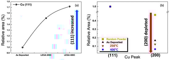 Relative area trend of the treated samples at 250 C and 400 C normalized to the as-deposited condition (a) of the (111) Cu peak and (b) the comparison between (111) and (200) Cu main peaks.