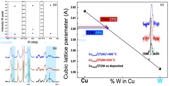 (a) XRD patterns, in the range 2 = 34–59, of the samples in as-deposited condition and with thermal treatment at 250 C and at 400 C; (b) intensity trend of the W peaks related to the light blue label shown in Figure 9; (c) Vegard plot of the XRD peak at 2 = 50.45 (see inset).