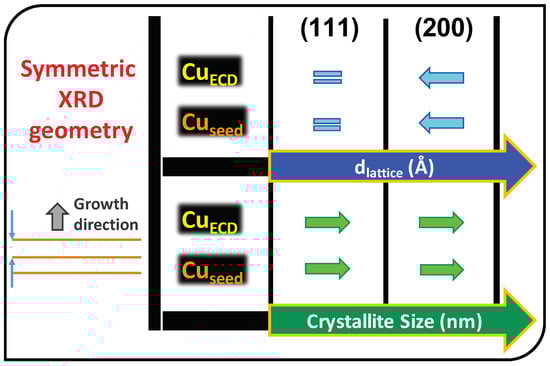 Schematized XRD comparison (referring to the data of Table 2) in terms of lattice spacing and crystalline size for and samples. The Cu peaks are related to the (111) and (200) planes located at 2 = 43.34 and 2 = 50.44, respectively.