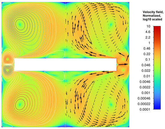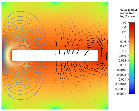 Normalized velocity field with streamlines (left) and velocity vectors (right) for the central position of a disk moving downward in a germanium melt (f = 25 Hz, A = 80 μm, R = 0.1 mm).