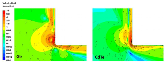 It is also clear that for less viscous germanium, inertial effects are much stronger. Hence, the higher speeds of jet flows from the corner, which create circulation in the main volume of the melt.