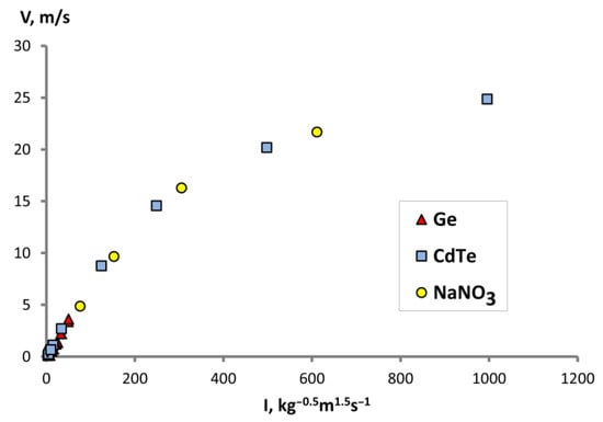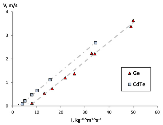 In the region of low frequencies and vibrations (Figure 6), in which the points of Ge and CdTe fall, a linear dependence is observed with a general slope of the straight line. The role of the shift of lines will be discussed in Section 4 when analyzing the obtained dependence. We observe that the linear dependence, hence the laminar flow regime, remains in the range of oscillation intensity from 10 to 50 kg−0.5 m1.5 s−1.