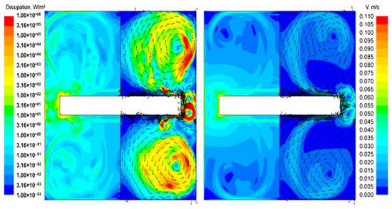 Numerical simulation of momentum viscous dissipation rate (left half of the simulated volume, see Section 3.2) and velocity contours colored by velocity magnitude and supported by velocity vectors for NaNO3 melt activated by oscillation (f = 25 Hz, A = 500 μm) of cylindrical disc with an edge radius 0.1 mm (left) and 0.8 mm (right).