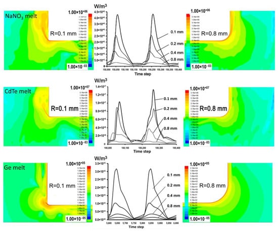 Numerical simulation of momentum viscous dissipation in NaNO3, CdTe (f = 25 Hz, A = 500 μm) and Ge (f = 25 Hz, A = 100 μm) melts activated by oscillation of cylindrical disc with different curvature of a sharp edge (R).