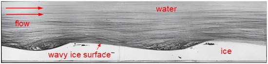 A wavy ice layer, as shown in Figure 1, results from the development of liquid–solid interface instability in the hydrodynamic flow [35]. At the initial moment of time , a groove was made on the ice surface (see Figure 8 in [35]), which transformed over time and led to the formation of the wavy ice surface. In the course of time, the downstream side of the groove melts to form a longer groove and the ice downstream of the groove becomes slightly wider. Approximately 2–3 h later, a second groove begins to form downstream about 15 cm from the initial groove. Over time, this sinusoidal-like wave propagates downstream, leading to the formation of several waves. As this takes place, the amplitudes of these waves also increase until the first wave downstream of the initial groove develops a sharp crest after about h. Subsequent waves also develop sharp crests, after which further changes in wave amplitudes cease and a so-called wavy or ripple ice surface is formed (wave crests are placed in a perpendicular to the flow). The waves continue to migrate slowly downstream. In the fluid flow downstream of the crest of each wave, there is a region of separated flow. An important point is that the ice surface is stable if it is reverted to a planar liquid–solid surface some time after the groove has been made. On the other hand, in the case of instability, the initial groove leads to the formation of a wavy surface, as described above.