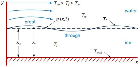 Let us formulate below a mathematical model of heat transfer describing the crystallization process with a wavy water–ice interface shown in Figure 2. The phase interface position is considered to be a sum of two contributions: the growing ice layer and its perturbation of the form