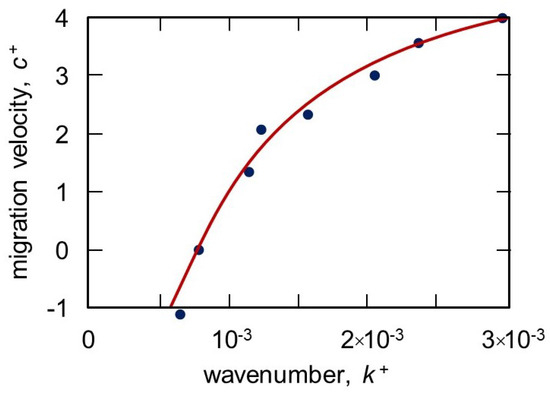 To calculate the migration velocity and dispersion relation, we first determined from the stationary Equation (15). As a result, the thickness of ice layer mm at °C, which is in full agreement with the experimental data [35]. Then, using , we illustrate the dimensionless migration velocity in Figure 3 for experimentally known range of wavenumbers [35]. The product defining the coefficient was fitted by the function . As is easily seen, the migration rate increases with increasing the wavenumber of perturbations.
