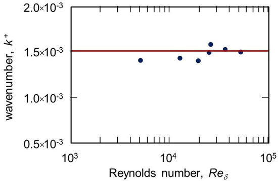 Dimensionless wavenumber of ice-surface waves corresponding to onset of morphological perturbations (wavy pattern formation) as a function of Reynolds number based on the boundary-layer thickness . Experiments [35] and theory are shown by symbols and solid line, respectively. Physical parameters correspond to Figure 3.