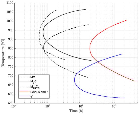 After soft-annealing treatment, the microstructure is fully austenitic, and primary carbides and nitrides are normally heterogeneously dispersed in the matrix [8,9,10,11,14,15]. These compounds are formed during solidification and mainly include niobium and titanium, leading to the depletion of these alloying elements in the surrounding regions [9]. The thermal exposure during processing, heat treatment and service can determine the precipitation of secondary phases. In fact, the presence of titanium, niobium, aluminum, chromium and molybdenum can activate complex precipitation phenomena with sufficient exposure above approximately 600 °C [9,10,15,16]. The formation of precipitates can strongly modify the mechanical properties and corrosion resistance with respect to the as-annealed condition [1,9]. The time–temperature–precipitation (TTP) curves available in the literature are reported and adapted in Figure 1 [9]. In particular, according to this diagram, the precipitate phases can be MC, M6C and M23C6 metal carbides, intermetallic phases, normally , , Ni2(Cr,Mo) and Laves, and (Cr,Nb)2N nitrides [9,15,17]. The chemical compositions of the primary and secondary phases are given in Table 1. The precipitation curve of the Ni2(Cr,Mo) phase with snowflake morphology is not shown in Figure 1. In fact, according to the literature, it is formed after very long exposures below 600 °C, and these time–temperature aging conditions lie outside the ranges investigated in this research. Its precipitation kinetics have not been investigated in depth in the literature [18,19]. The formation of intergranular carbides and intermetallic phases determines sensitization and the reduction in ductility and deformability [4,20,21]. In fact, intergranular chromium- and molybdenum-rich carbides deplete such alloying elements from their surroundings, resulting in a local reduction in the resistance to intergranular corrosion [1,2,3,4,9,15,20,21,22]. Moreover, the formation of intergranular carbide films promotes intergranular cracking with a consequent decrease in toughness. For this reason, during service and cooling from the annealing temperature, exposure above 600 °C should be carefully monitored to avoid the formation of precipitate phases. However, the controlled formation of intermetallic phases can be exploited to obtain a hardening effect [15,19].
