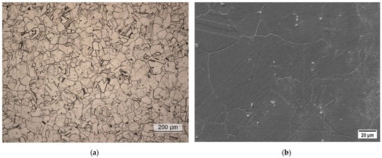Metallographic analysis of the soft-annealed material. (a) Light-optical micrograph; (b) scanning electron micrograph.