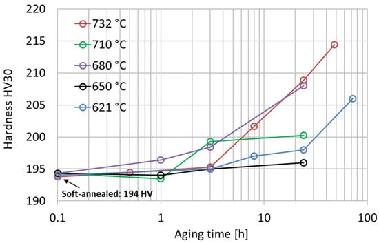 Vickers hardness HV30 experimental curves after isothermal single-aging treatments from 621 °C to 732 °C of the soft-annealed material. The standard deviations of these hardness measurements range from 1 HV30 to 3 HV30.