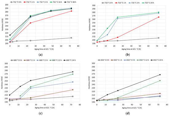Vickers hardness HV30 experimental curves after double-aging treatments of the soft-annealed material varying the primary-aging temperature from 732 °C to 650 °C and with secondary aging temperature fixed at 621 °C: (a) 732 °C; (b) 710 °C; (c) 680 °C; (d) 650 °C. The standard deviations of these hardness measurements range from 1 HV30 to 6 HV30.
