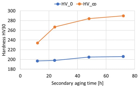 and values as a function of the duration of the secondary aging treatment (Time_2) in hours.