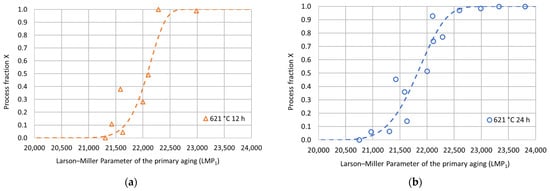 To better investigate the hardness increase induced by the double-aging treatment, the hardness process fraction curves were determined according to Equation (1) for each tested duration of the secondary aging at 621 °C. In particular, is the double-aging hardness in the absence of primary aging. Therefore, this value coincides with the experimental hardness of single aging at 621 °C for the considered duration. represents the steady-state hardness value upon double aging for each considered secondary aging time. Their values are summarized in Table 4 and Figure 6. The experimental process fractions for each secondary aging time are reported as a function of the Larson–Miller parameter () of the primary aging treatment in Figure 7. The expression of the parameter is given in Equation (2), where is the primary aging absolute temperature, is a constant (set equal to 22) and is the primary aging time in hours. The adoption of the Larson–Miller parameter allows us to combine the effects of both the primary aging temperature and time into a single value. In general, creep, tempering of a quenched steel and precipitation of strengthening phases are typical phenomena that can be studied with this approach. The use of a single variable, the Larson–Miller parameter, simplifies the analysis of all the properties that change with respect to treatment temperature and time. This approach also allows for an easier correlation among these properties and the process parameters.