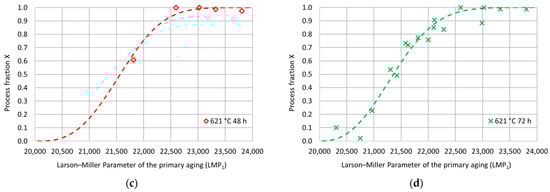 Experimental hardness process fractions and fitting curves as a function of the Larson–Miller parameter for the primary aging treatment for each secondary aging duration: (a) 621 °C 12 h; (b) 621 °C 24 h; (c) 621 °C 48 h; (d) 621 °C 72 h.