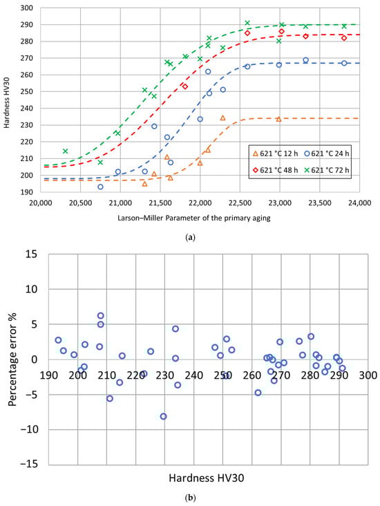 Experimental hardness values and fitting curves for each secondary aging time as a function of the Larson–Miller parameter of the primary aging treatment (a) and distribution of the percentage errors as a function of the hardness (b).