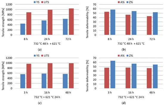 Room-temperature tensile properties (yield strength, YS; ultimate tensile strength, UTS; percentage elongation after fracture, A%; percentage reduction of area, Z%) of the soft-annealed material subjected to double-aging treatments at 732 °C and 621 °C for different times. (a,b) Influence of the increase in the secondary aging time; (c,d) influence of the increase in the primary aging time.
