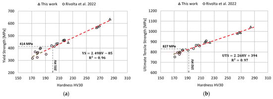 Relationships between the tensile properties and the hardness via linear regression model. Data from the literature has been considered to improve the accuracy of the regression model [11]. (a) Relationship between the yield strength and the hardness; (b) Relationship between the ultimate tensile strength and the hardness.