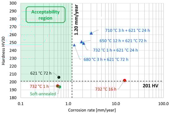 Performance map of the experimental conditions tested in this research work by hardness and corrosion tests. The two dashed lines represent the limit values for both the hardness and the corrosion rate according to the alloy performance requirements [12]. The acceptability region is highlighted by green shading.