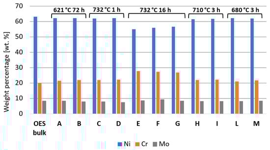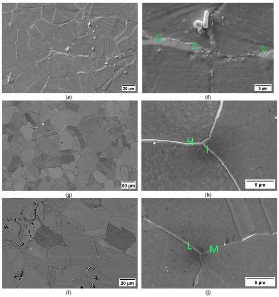 The susceptibility to intergranular corrosion was investigated in a selection of the single- and double-aging conditions tested in this research. The corrosion rate limit was set equal to 1.20 mm/year, while the minimum hardness of 201 HV was determined based on the minimum standard requirement for the mechanical strength [12] and the hardness–yield strength relation defined in this paper. Therefore, a performance map was built and populated with the experimental conditions selected for the corrosion tests, as shown in Figure 11. The soft-annealed condition is acceptable only in terms of corrosion resistance. Upon single aging at 732 °C, the hardening effect is poor, and 16 h is required to exceed the minimum hardness requirement. However, at this exposure, the corrosion rate is significantly far from acceptability. At this temperature, such behavior is determined by the precipitation of intergranular chromium-rich carbides, which strongly reduce the corrosion resistance. On the other hand, upon single aging at 621 °C, the precipitation of precipitates is faster than the formation of intergranular carbides. In fact, at this temperature, as shown by the TTP diagram in Figure 1, the intergranular M23C6 carbides precipitate after aging times that are significantly longer than those required at 732 °C. Therefore, consistent with these observations, single aging at 621 °C for 72 h provides an acceptable combination of mechanical and corrosion properties, as shown in Figure 11. The formation of intergranular carbides was investigated in detail by SEM and EDXS analyses in selected conditions. As shown in Table 5, Figure 12 and Figure 13, intergranular carbides were not detected upon single aging at 621 °C until 72 h. This observation justifies the presence of an acceptable corrosion resistance in this aging condition. Regarding single aging at 732 °C, discrete chains of intergranular carbides were identified in the sample aged for 16 h. No carbides were detected in the 1 h aged sample. As shown by the EDXS analyses reported in Table 5 and summarized in Figure 12, the chemical composition of the carbides observed in the 16 h aged sample (positions E, F and G of Figure 13f) was enriched in chromium and, to a lesser degree, in molybdenum, as also confirmed by the literature for M23C6 carbides [9,17]. The formation of these compounds agrees with the TTP curves available in the literature [9] and reported in Figure 1. Their occurrence is expected to decrease the corrosion resistance. As previously mentioned, at lower aging temperatures, such particles are absent, especially at 621 °C, where 72 h is not sufficient for the precipitation of such detrimental Cr-rich phases.