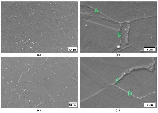 All the samples for metallographic observations, hardness, tensile and intergranular corrosion tests were taken from a forged and untreated 60 mm diameter rod. All the heat treatments were performed in a laboratory furnace (Model Carbolite CWF 13/13). Tensile and corrosion specimens were obtained from the longitudinal direction of the rod. Samples for microstructural analyses and hardness tests were cut using silicon carbide cutoff wheels with a Remet (Model TR100 EV; sourced from Remet s.a.s., Bologna, Italy) cutting machine. Mounting was performed in hot thermosetting phenolic resin using a Metkon (Model Ecopress 50; sourced from Microcontrol N.T. Srl, Milano, Italy) mounting machine. Grinding and polishing were carried out using a Struers (Model Pedemax 2 + Planopol 3; sourced from Struers s.a.s., Arese, Italy) machine up to the mirror-polished condition. After grinding and polishing, chemical etching was performed in five parts HCl diluted in one part 30% H2O2 for approximately 10 s [5,31,32]. A Leica (Model DMR; sourced from Leica Microsystems S.r.l., Buccinasco, Italy) light optical microscope and a Zeiss (Model SIGMA 500; sourced from Carl Zeiss S.p.A., Milano, Italy) scanning electron microscope were used for the metallographic analyses. The determination of the average grain size in the soft-annealed condition was performed in accordance with the ASTM E112 standard [33]. In this case, the Heyn lineal intercept procedure was adopted using twelve linear intercept lines. The hardness was measured in HV30 Vickers scale using a Wolpert Testor 930 hardness tester according to the EN ISO 6507 standard [34]. In each condition, five hardness measurements were performed. The room-temperature tensile properties were investigated by tensile tests performed according to the EN ISO 6892 standard using round proportional specimens with an INSTRON model 4507 testing machine [35]. The susceptibility to intergranular corrosion was analyzed using a solution of ferric sulfate, Fe2(SO4)3 and sulfuric acid, H2SO4, for 120 h according to the ASTM G28—Method A standard [30]. The reference standard considered in this work for the mechanical strength requirements of this alloy is the ASTM B446 standard [12]. Considering the maximum corrosion rate, a value of 1.20 mm/year was considered to be a common prescription for industrial applications of this grade. SEM and EDXS analyses were performed on a selection of metallographic samples. Qualitative EDXS analyses of the chemical composition were carried out using an OXFORD Altee Energy—Advanced detector available in the adopted SEM.