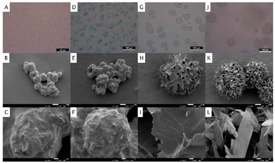 Upper row: polarized light microscopy images after one hour of isothermal crystallization. Middle and lower row: cryo-SEM images of de-oiled fat samples at magnifications of ×1000 (top, scale bar = 10 µm) and ×7500 (bottom, scale bar = 1 µm). Picture (A–C) shows FC-20, (D–F) SC-20, (G–I) FC-25, and (J–L) SC-25. Sample abbreviations can be found in Table 1.