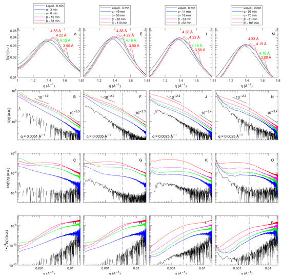 Oil is characterized in WAXS by a broad peak around q = 1.36 Å−1 (Figure 3A,E,I,M, black). A slight change in the peak position toward q = 1.39 Å−1 appeared when cooling is applied. Mazzanti et al. (2021) related the shift in the broad peak to the structuring of the liquid TGs [43]. In USAXS, the oil profiles obtained are dominated by noise caused by the subtraction protocol (Figure 3B,F,J,N, black; USAXS and WAXS). Upon cooling above the crystallization temperature, the intensity of the USAXS profile increased to a similar extent over the full q-range compared to the liquid baseline, removing the noise domination and creating a straight profile.