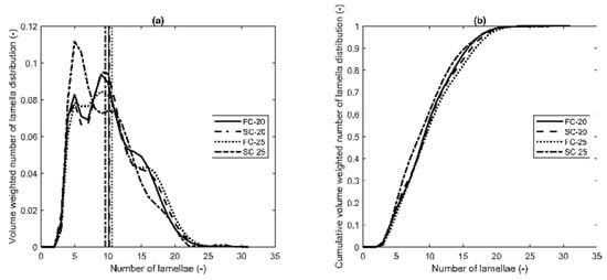 The Scherrer equation was applied to estimate the average size of the thickness of the CNPs. An average of 12.0 ± 0.1 a, 12.3 ± 0.1 a, 12.7 ± 0.2 a, and 11.5 ± 0.5 a was found for FC-20, SC-20, FC-25, and SC-25 (Table 2). This results for all samples in similar average domain sizes of approximately 500 Å. The domain size is assumed to be the smallest dimension of the CNP. The BWA method provides a distribution of the number of lamellae making up the CNPs. As such, it serves as an assessment of the heterogeneity of the CNP thicknesses making up the solid fat and is more informative than the Scherrer equation. Figure 6 shows the volume-weighted number of lamellae distributions for FC-20, SC-20, FC-25, and SC-25 after one hour of isothermal time and their cumulative counterpart. A broad distribution was found for all protocols after one hour of isothermal crystallization, resulting in domain sizes of 127 to 1013 Å. As these results come from lab-scale SAXS data, which is prone to peak broadening, it is assumed that the actual numbers will be slightly higher. The number of lamellae range from 3 to 24. The start and end points of the distribution are narrower than the limits that were provided to the BWA method (0–30 lamellae). The volume-weighted average value of the distributions is similar for all cooling protocols: 10.1 a ± 0.1, 10.2 a ± 0.1, 10.6 a ± 0.3, and 9.6 a ± 0.5 for, respectively, FC-20, SC-20, FC-25, and SC-25 (Table 2). The average trends seen by the BWA method are thus similar to those found by the Scherrer equation. The number found by the BWA method is smaller, as found by den Adel et al. (2018) and Rondou et al. (2022) [2,24]. After one hour of isothermal crystallization, around 60% of the CNPs consist of 3–10 lamellae and about 40% of 11–20 lamellae. As such, we can conclude that this analysis unravels the wide variety of thicknesses present within the CNPs of one cooling protocol. Despite the fact that USAXS analysis suggests differences in the overall CNP size under the different cooling protocols, the thickness of the CNP (smallest dimension) is similar for all samples. A comparable result was obtained by Acevedo et al. (2011), where slowly cooled FHCO/HOSO 1/1 resulted in clearly longer and wider CNPs than the fast-cooled sample, but the thicknesses remained similar [47].