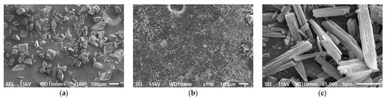 SEM photograph of (a) TELHCl-Hyd and (b) TEL crystals at 100× magnification. (c) SEM photograph of TEL crystals at 5000× magnification.