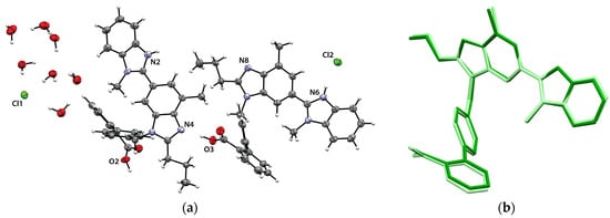 TELHCl-Hyd crystallizes in the triclinic P-1 space group comprising two telmisartan cations, two chloride anions, and seven water molecules (Figure 3a). Both telmisartan molecules are protonated on the N2 and N6 positions of the benzimidazole, respectively. Hence, TELHCl-Hyd is a trihemihydrate (3.5H2O) hydrochloride salt of telmisartan. Meanwhile, both symmetry-independent telmisartan cations share similar conformations despite their conformational flexibility, as shown in Figure 3b. The cations exist with a disorder in the propyl group of the benzimidazole ring. The occupancy factors of the major disordered parts of both independent telmisartan cations are refined as 0.66 and 0.57, respectively.