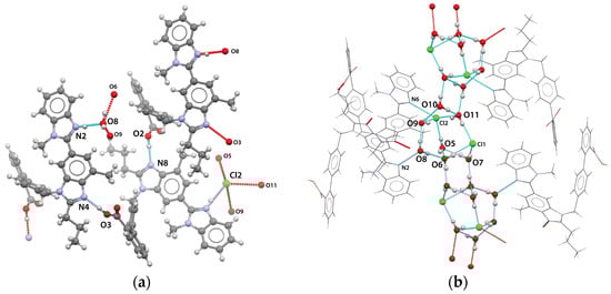 Interestingly, all seven water molecules were located close to each other, forming a cluster of hydrates with extensive intermolecular hydrogen bonding (Figure 4b). Five water molecules, i.e., O5, O7, O8, O9 and O10, were involved as donors in two hydrogen bonds and as an acceptor in one hydrogen bond. On the other hand, O6 and O11 took part in four hydrogen bond interactions. Only one water molecule (O8) was involved in hydrogen bonding with the telmisartan molecule. The hydrogen bond details are summarized in Table 2.
