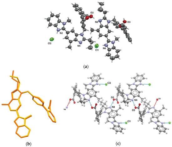 (a) Thermal ellipsoid drawing of TELHCl-A at a 50% probability level. Only the atoms involved in the hydrogen bonding described are labeled for clarity. (b) Overlay structure of telmisartan cations in TELHCl-A. Hydrogen atoms are omitted for clarity. (c) Hydrogen bonding motif in TELHCl-A highlighting the interactions between each molecule in the asymmetric unit forming a 1-D chain structure. Only the atoms involved in the hydrogen bonding described are labeled.