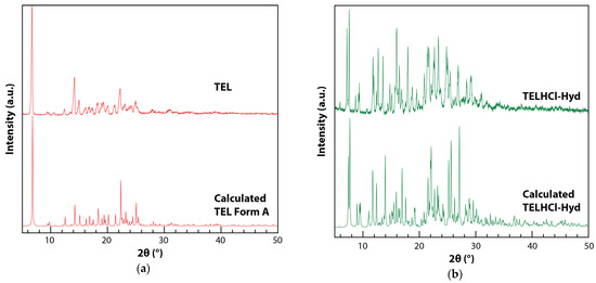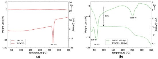 Subsequently, a thermal analysis of TEL and TELHCl-Hyd was carried out. The TG–DTA curve of TEL is shown in Figure 7a. A sharp endothermic peak at 268.7 °C corresponds to the melting of the higher melting point polymorph of TEL Form A. The stable TEL Form A was reported to undergo melting at 263–272 °C [5,8,9,33,34,35].