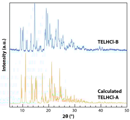 It should be noted that no additional peak or thermal event was observed after the dehydration process except for the final melting/decomposition. We hypothesize that TELHCl-A could be obtained only through recrystallization of TELHCl-Hyd from the solvent. A more detailed study is planned to investigate the relationship between TELHCl-A, TELHCl-B, and TELHCl-Hyd.