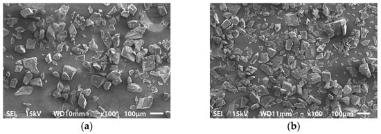 SEM photograph of (a) TELHCl-Hyd and (b) TELHCl-B at 100× magnification.