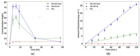Solubility (a) and intrinsic dissolution (b) curves of TEL and TELHCl salts. Phosphate buffer pH 7.5 was used as the medium.