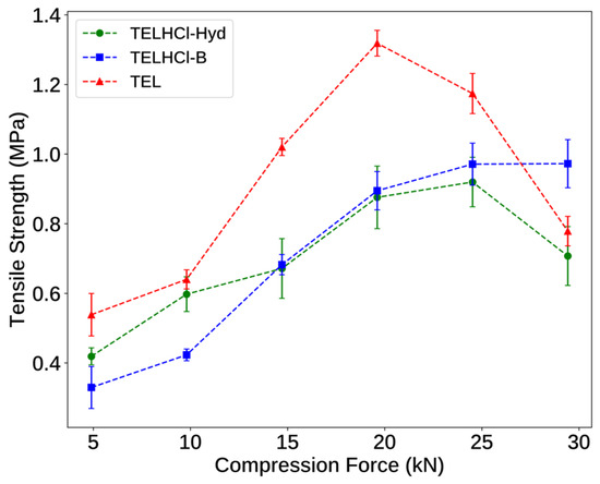 Finally, we evaluated the powder compaction behavior of TEL and its salts. The relationship between the compaction force and tensile strength is presented in Figure 14.