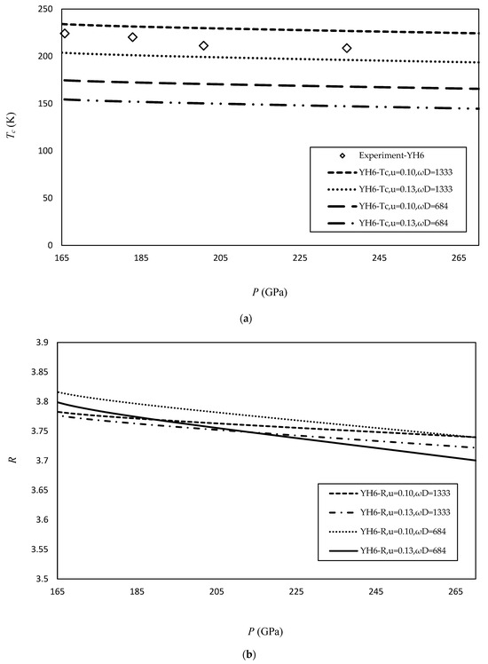 The numerical calculations for (a) the critical temperature (Tc) and (b) the gap-to-Tc ratio (R) for the YH6 superconductor.