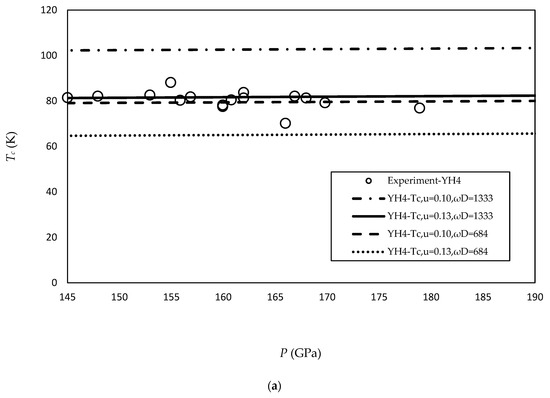Consider the crystal structure of yttrium hydrides and their critical temperature: TC, in Figure 1a, with I4/mmm-YH3, had 40 K at 50 GPa [18,19,20,21]. The lattice parameters are , and [9]. In Figure 1b, I4/mmm-YH4 had 85–95 K at 300 GPa. The lattice parameters are , , and [9]. In Figure 1c, Imm2-YH7 had 21–43 K at 165 GPa. Figure 1d shows that Im3m-YH6 had 251–264 K at 200 GPa. The lattice parameters are , and [9]. Figure 1e shows that P63/mmc-YH9 had 253–276 K at 300 GPa. The lattice parameters are , , with , [9]. We found that Im3m-YH6 and P63/mmc-YH9 were attributed to their hydrogen cage structure having a higher TC than (b) I4/mmm-YH4 and (d) Imm2-YH7. In the case of YH10 [9,22], a high TC of about 303 K at 400 GPa was calculated and predicted; the lattice parameters are and . The calculation used [18], which contrasts with a recent study that used a larger value. However, the peculiar geometry by which yttrium hydrides implement a dense hydrogen lattice compromises H packing and structural stability.